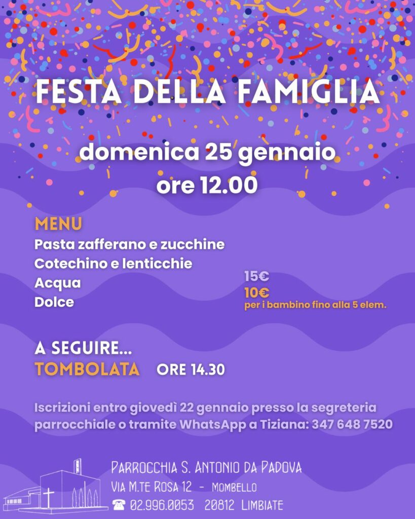 AvvisiIn evidenza FESTA DELLA FAMIGLIA By redazione momb - 14 Gennaio 2026 0 FacebookTwitterPinterestWhatsApp